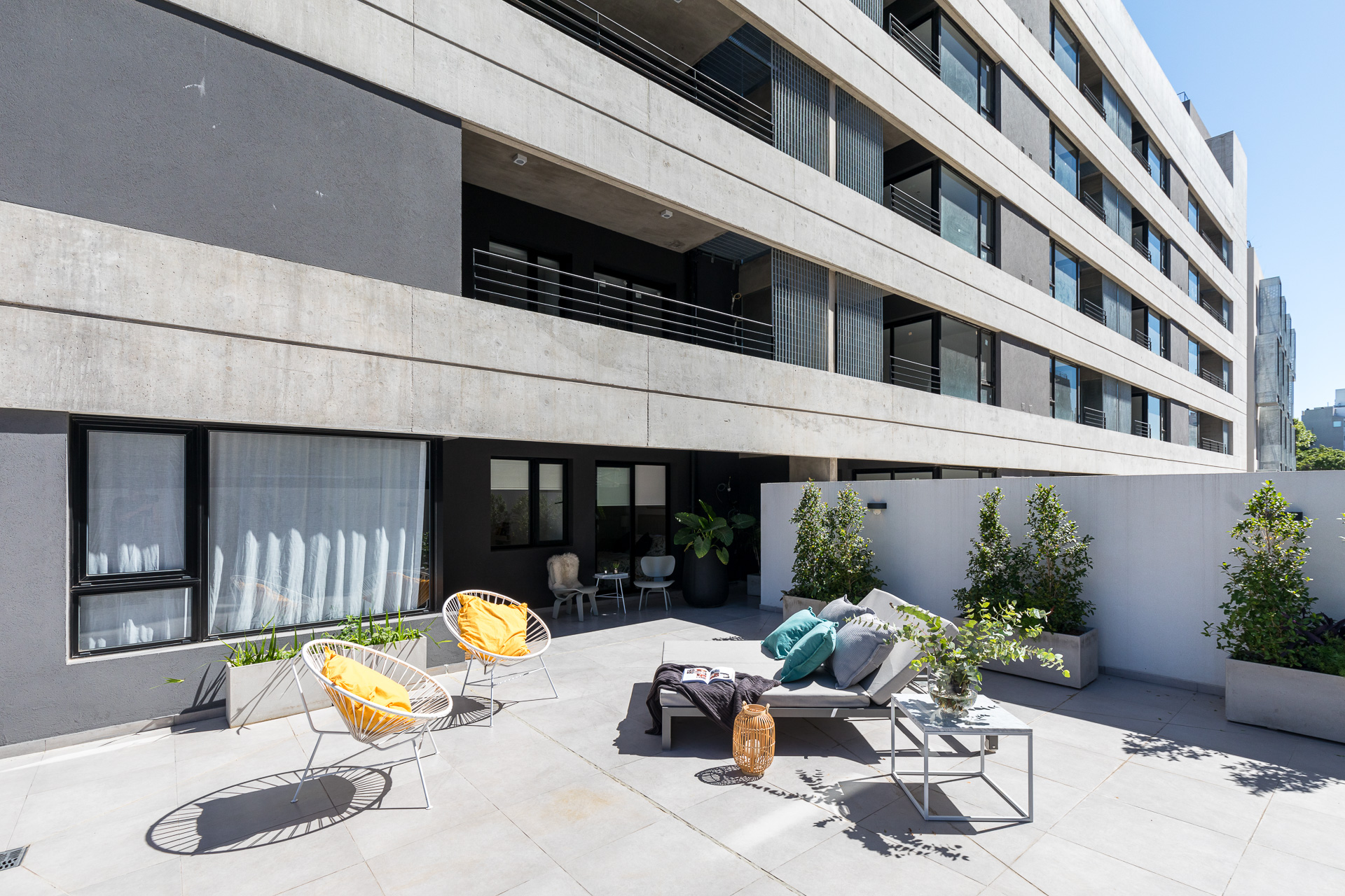 1 manzana, 7 edificios, departamentos con jardín y terraza, dúplex, locales comerciales y cocheras.