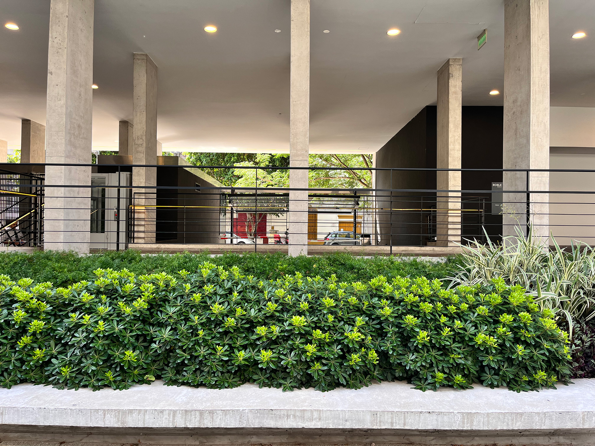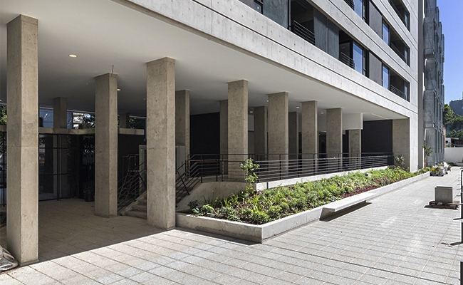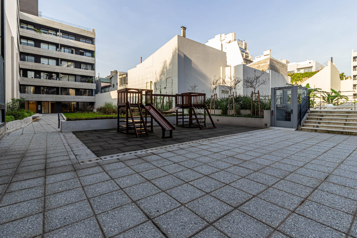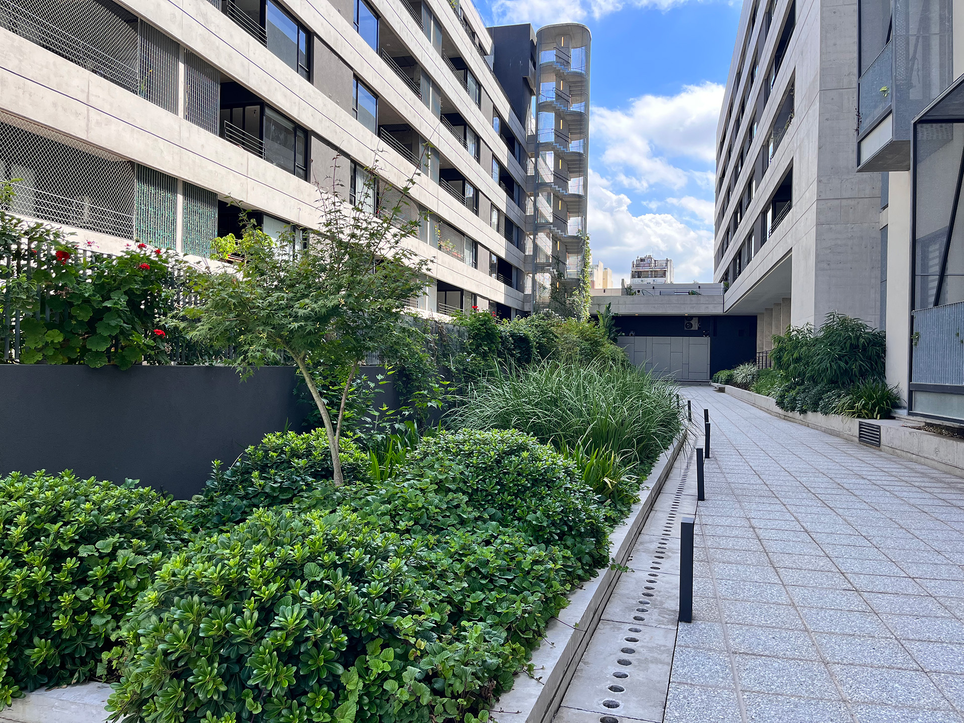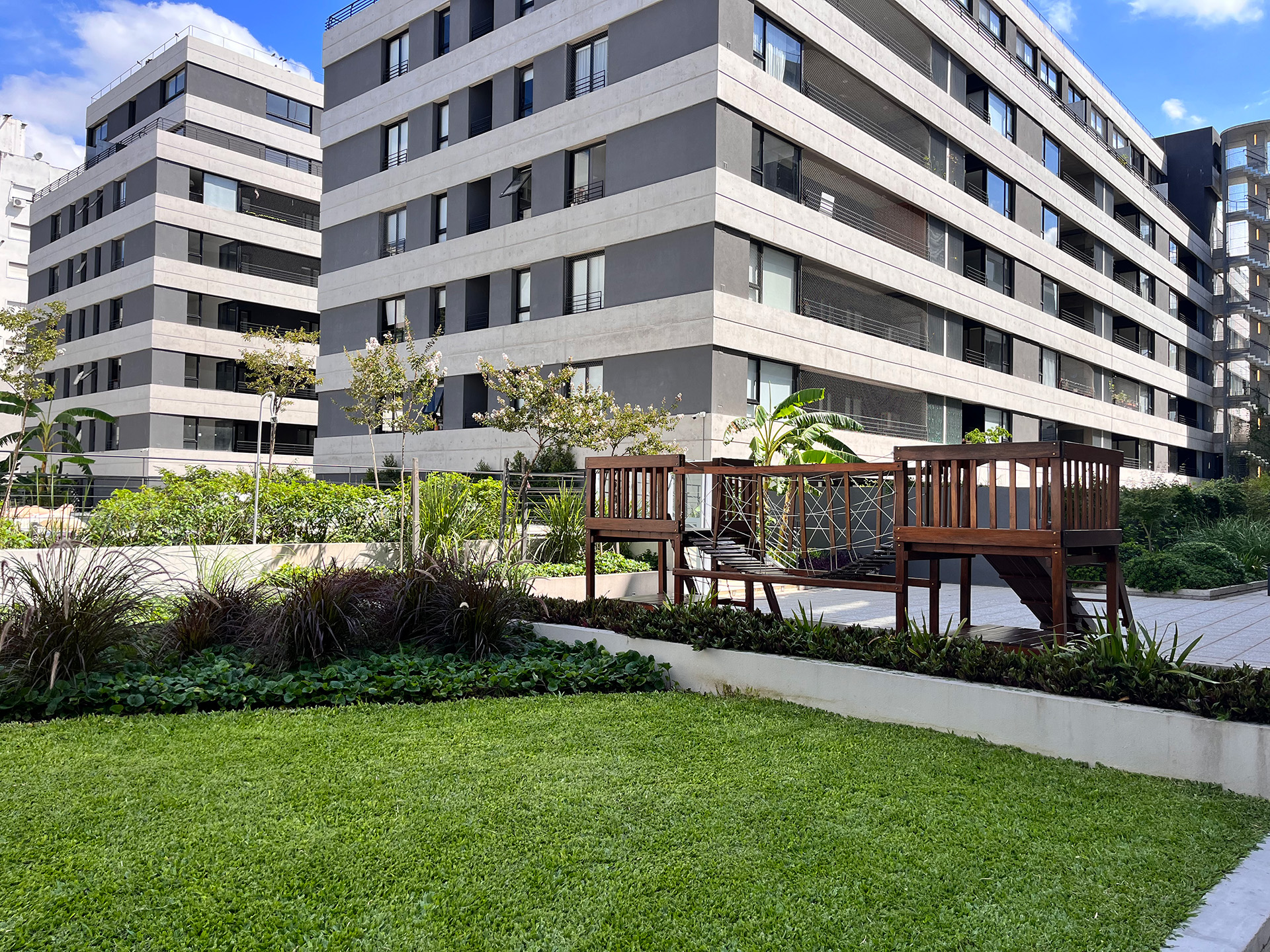 Amplios espacios verdes en medio de todos los edificios del área.